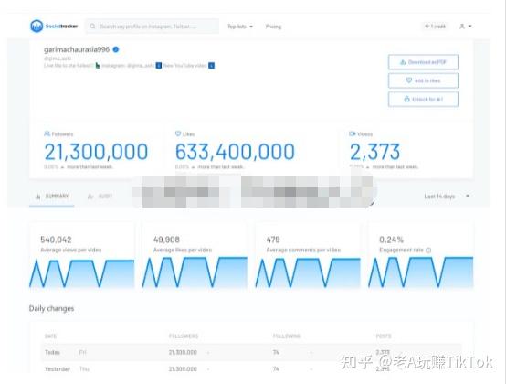 除了TikTok的播主,SocialTracker还收录了Instagram、Twitter、Youtube等大型的社交平台的播主,针对个体播主生成分析报告。这个平台提供了行业指标。我们播主的数值和行业基准指标对比,可以发现该播主的表现。同时,SocialTracker也追踪播主的重要指标,每天卡点记录播主的涨粉量、点赞增量以及视频增量,并且附有相关图表,这样用户可以很直观的看到播主的重要指标的变化趋势。
